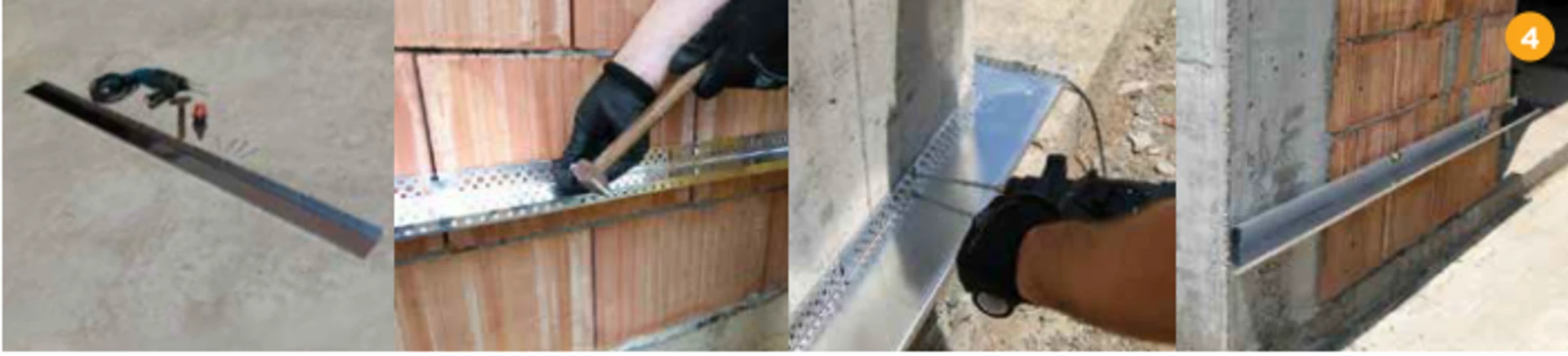 Dacă marginile exterioare ale bucăţilor de profil nu sunt perfect aliniate, montează câteva pene între profilul metalic şi perete şi lasă o distanţă de 3 mm între două profile adiacente pentru compensarea dilatărilor.