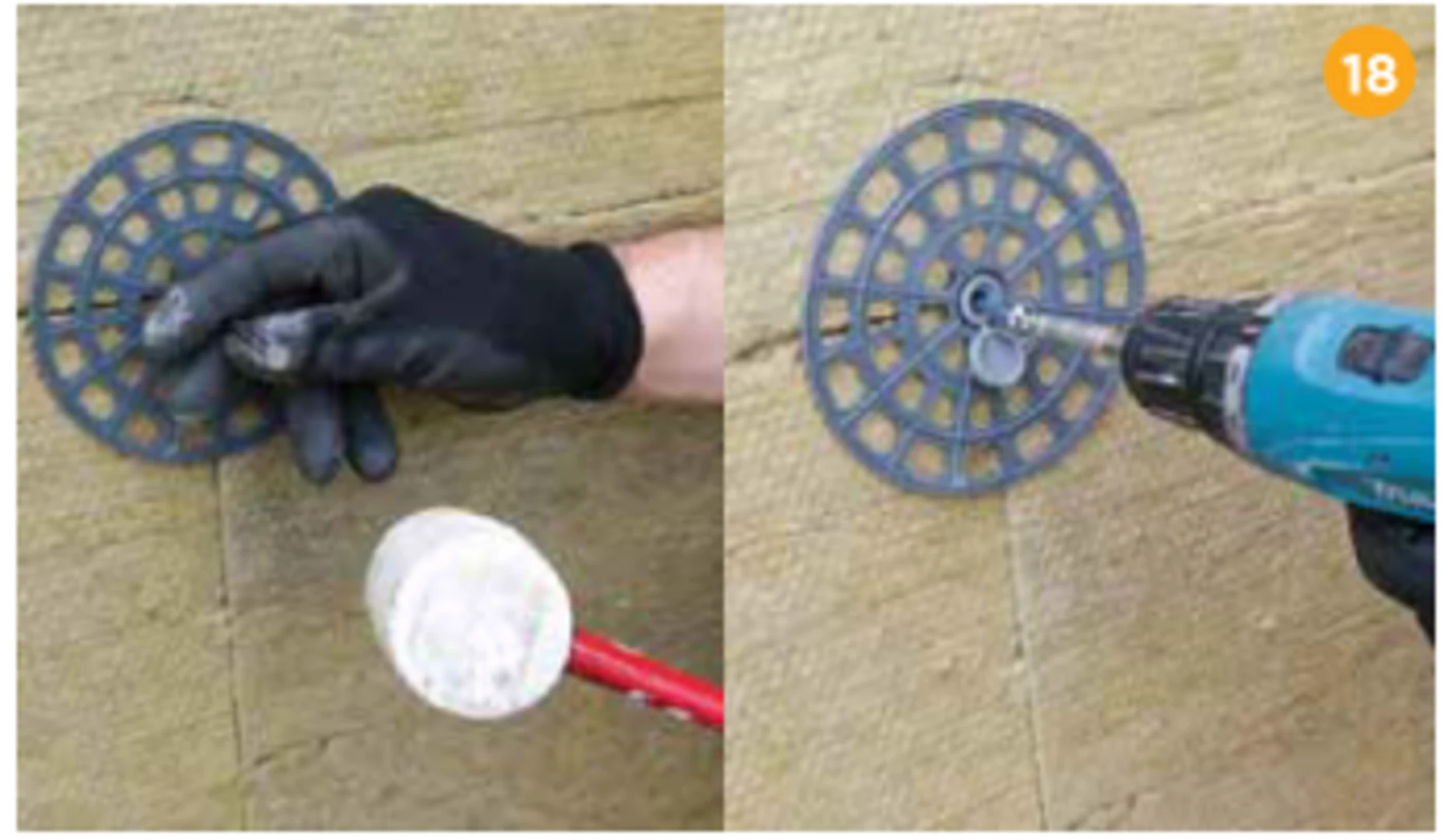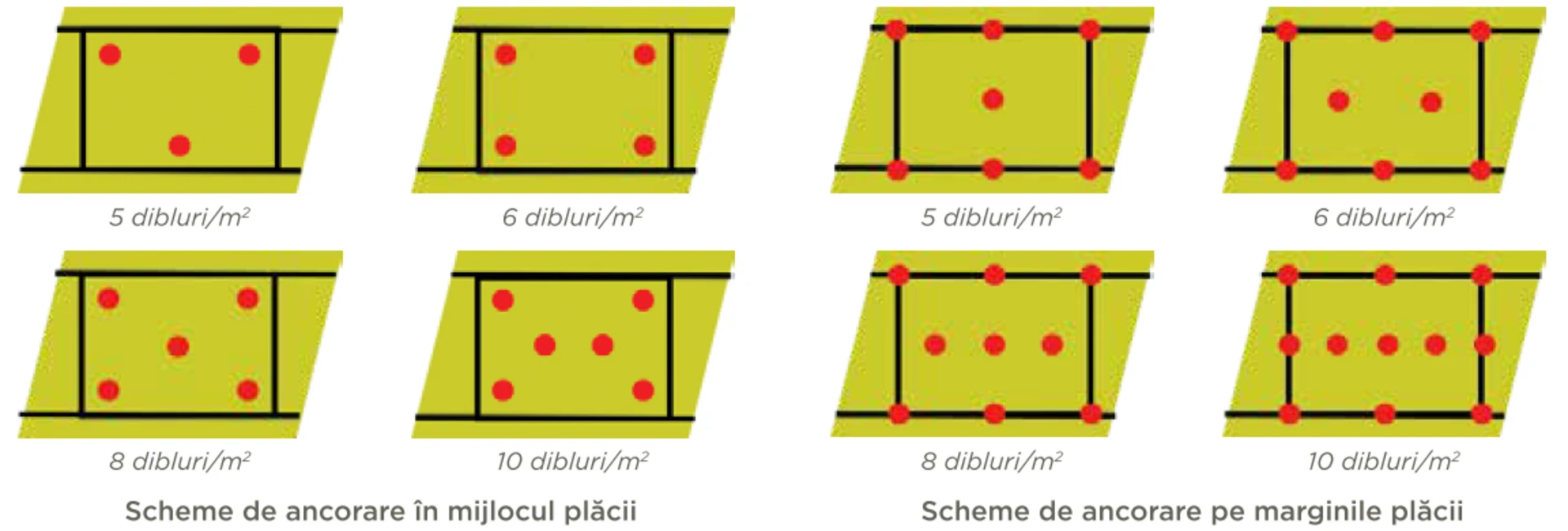 Diblurile cu rozetă se montează după întărirea mortarului adeziv, la circa 24 de ore după lipirea plăcilor de vată minerală. În zonele de colţ îți recomandăm folosirea unor dibluri cu diametrul rozetei de minimum 60 mm. Adâncimea găurii de ancorare în materialul de rezistenţă al peretelui suport va fi ≥ 45 mm. La această valoare adaugă grosimea tencuielii existente pe peretele suport (în cazul renovării unei faţade existente) şi grosimea plăcilor de vată minerală, rezultând în acest fel lungimea tijei diblului