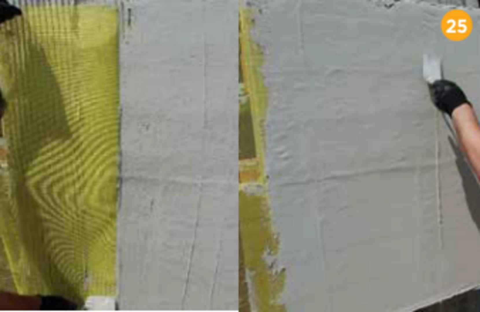 Poţi trece acum la aplicarea celui de-al doilea strat de masă de şpaclu. Suprapune două bucăţi de plasă de armare adiacente pe aproximativ 100 mm, fără ca stratul rezultat să aibă abateri de planeitate. Întinde apoi cel de-al doilea strat de masă de şpaclu astfel încât grosimea totală a stratului de mortar armat să fie de 3-5 mm.