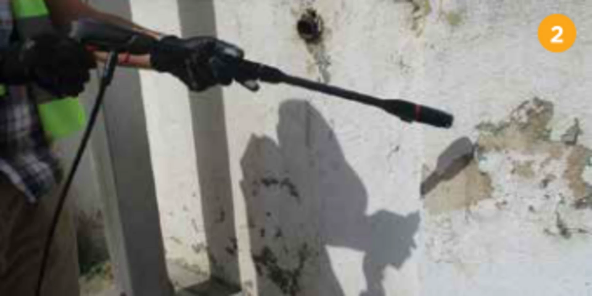 După ce ai înlăturat tencuiala veche, aplică un strat nou de tencuială, utilizând grundul universal de profunzime weber GR100 (pentru a asigura aderenţa corespunzătoare şi pentru a regla absorbţia de apă a suportului) şi mortarul de tencuire pe bază de ciment weber BC15.