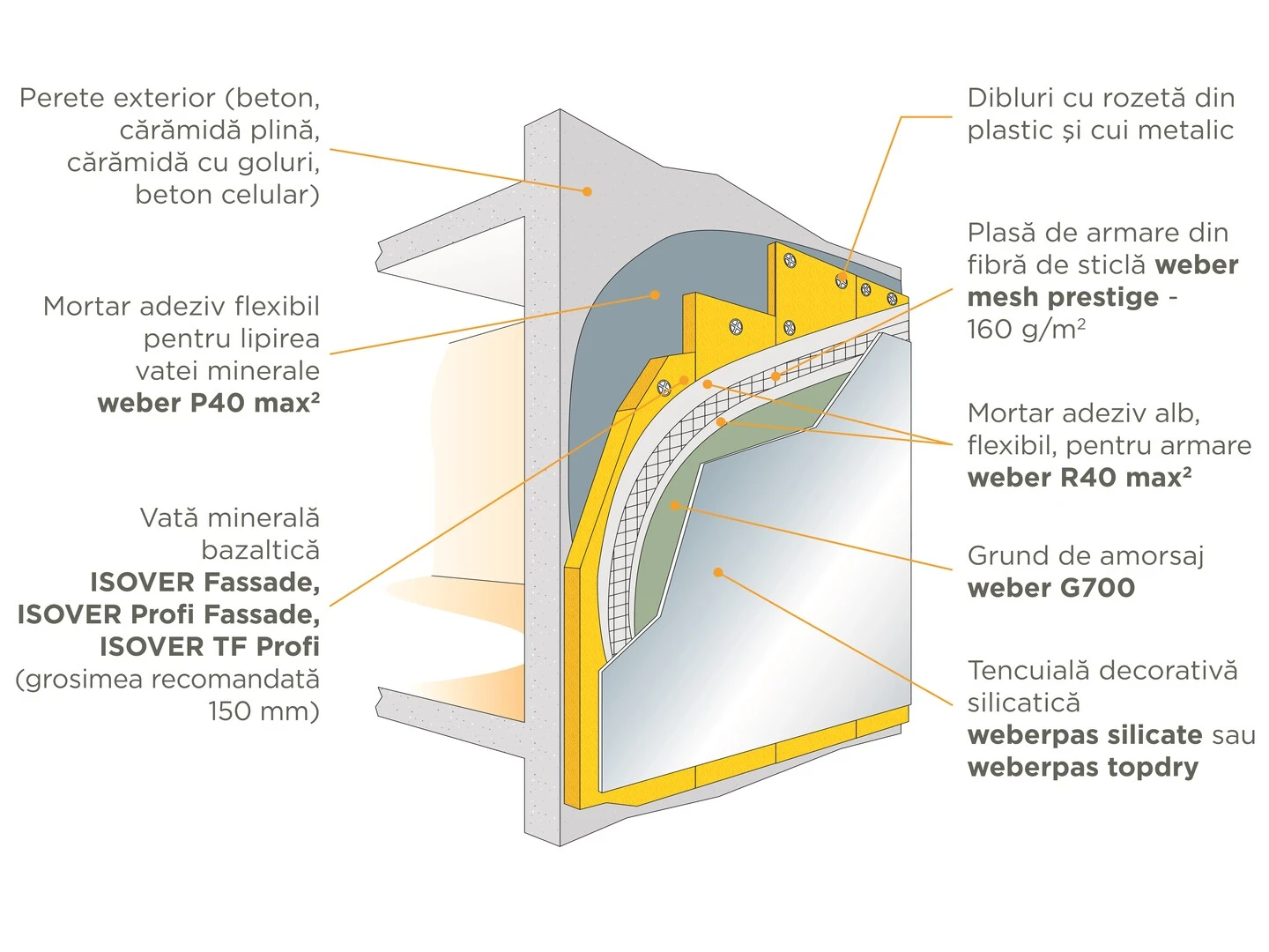 Știai că energia consumată pentru încălzire depinde, printre altele, de pierderile de căldură ale elementelor constructive care separă spaţiul locuit de mediul exterior? Aceste pierderi de căldură pot fi reduse prin izolarea la exterior cu webertherm prestige, un termosistem (en. External Thermal Insulation Composite System, prescurtat ETICS) pe bază de vată minerală, destinat izolării termice şi fonice a pereţilor exteriori, fiind una dintre cele mai eficiente metode pentru scăderea consumului de energie.