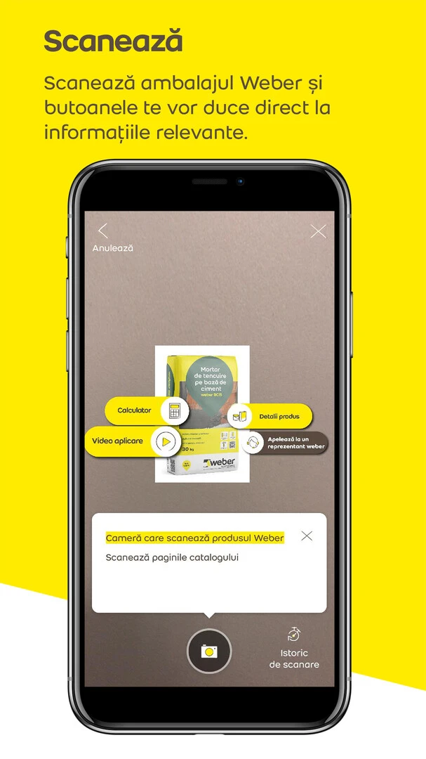 - Datorită funcției SCANARE și RECUNOAȘTERE A PRODUSULUI, te redirecționează spre 4 link-uri utile – detalii produs, calculator necesar de materiale pentru lucrare, video, contacte